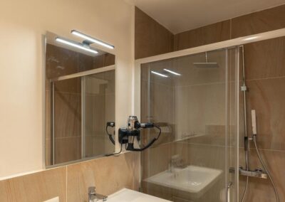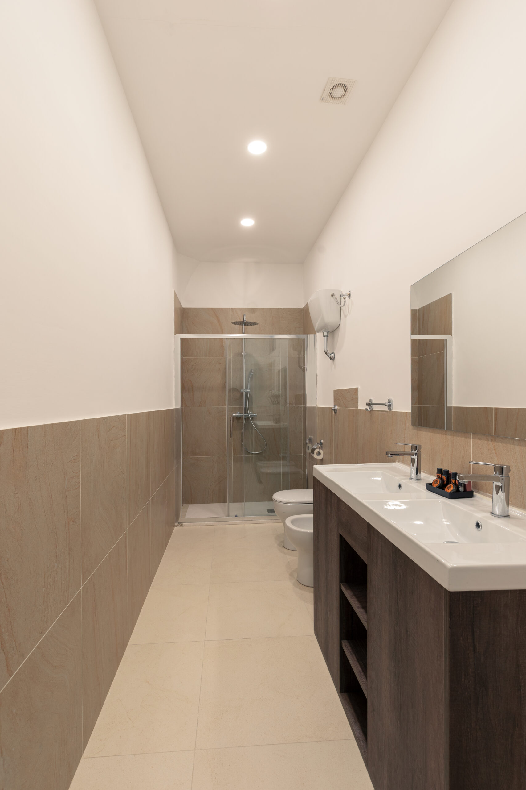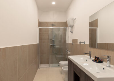 - Bagno con doppio lavabo, doccia spaziosa, bidet, WC e asciugamani